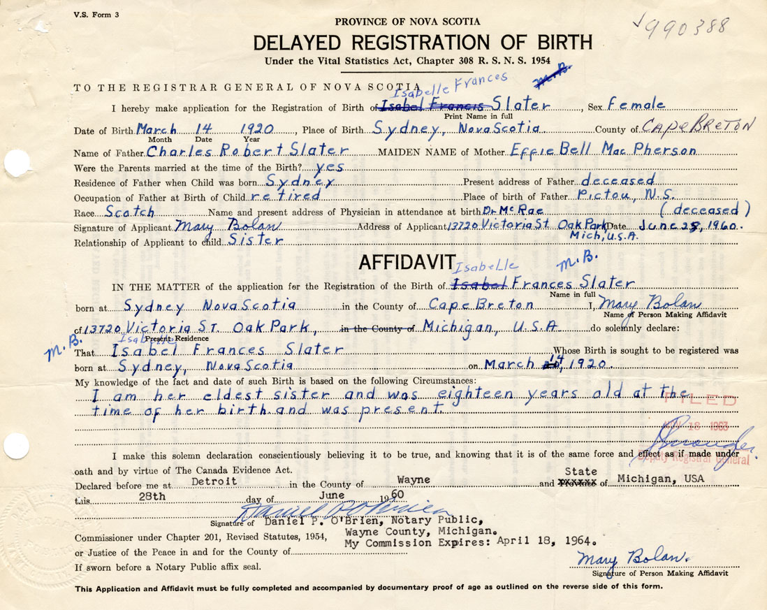 Name of Father Charles Robert Slater MAIDEN NAME of Mother Effie Bell MacPherson