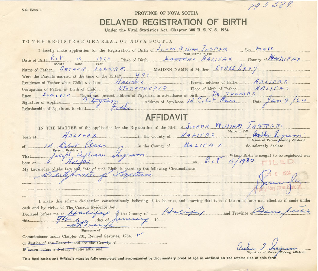 Signature of Applicant A. Ingram Address of Applicant 14 Cabot Place, Halifax Date 9 January 1964