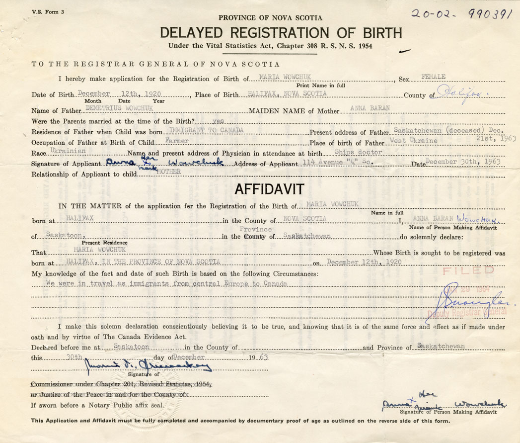 I hereby make application for the Registration of Birth of MariaWowchuk Sex Female