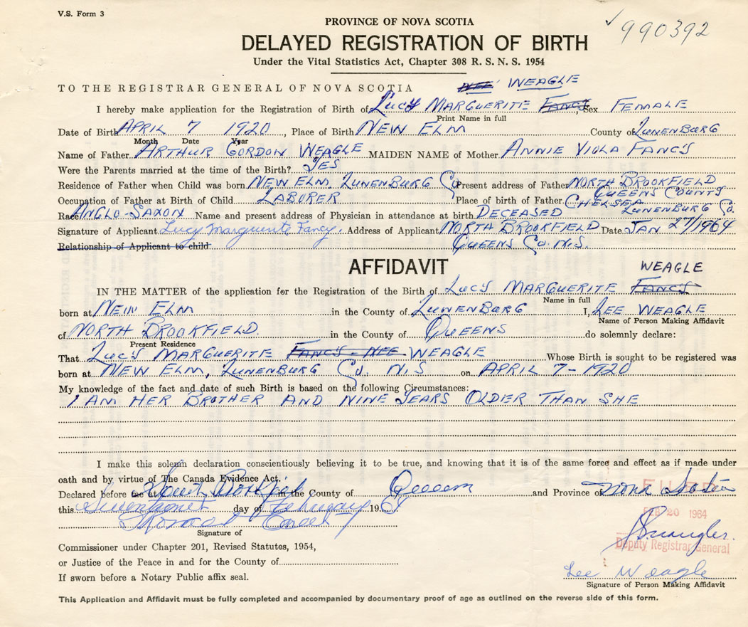 Date of Birth April 7, 1920 Place of Birth New ElmCounty of Lunenburg