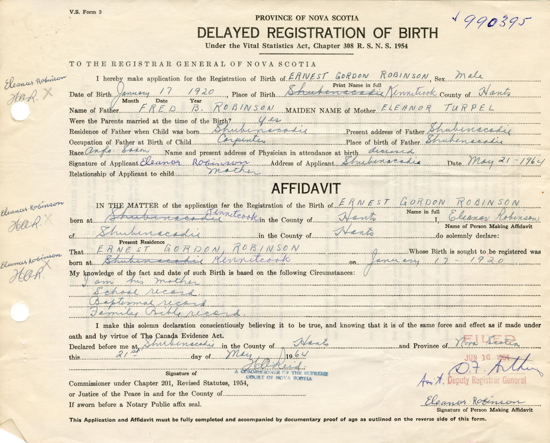 Signature of Applicant Eleanor Robinson Address of Applicant Shubenacadie, Hants Co. Date 21 May 1964