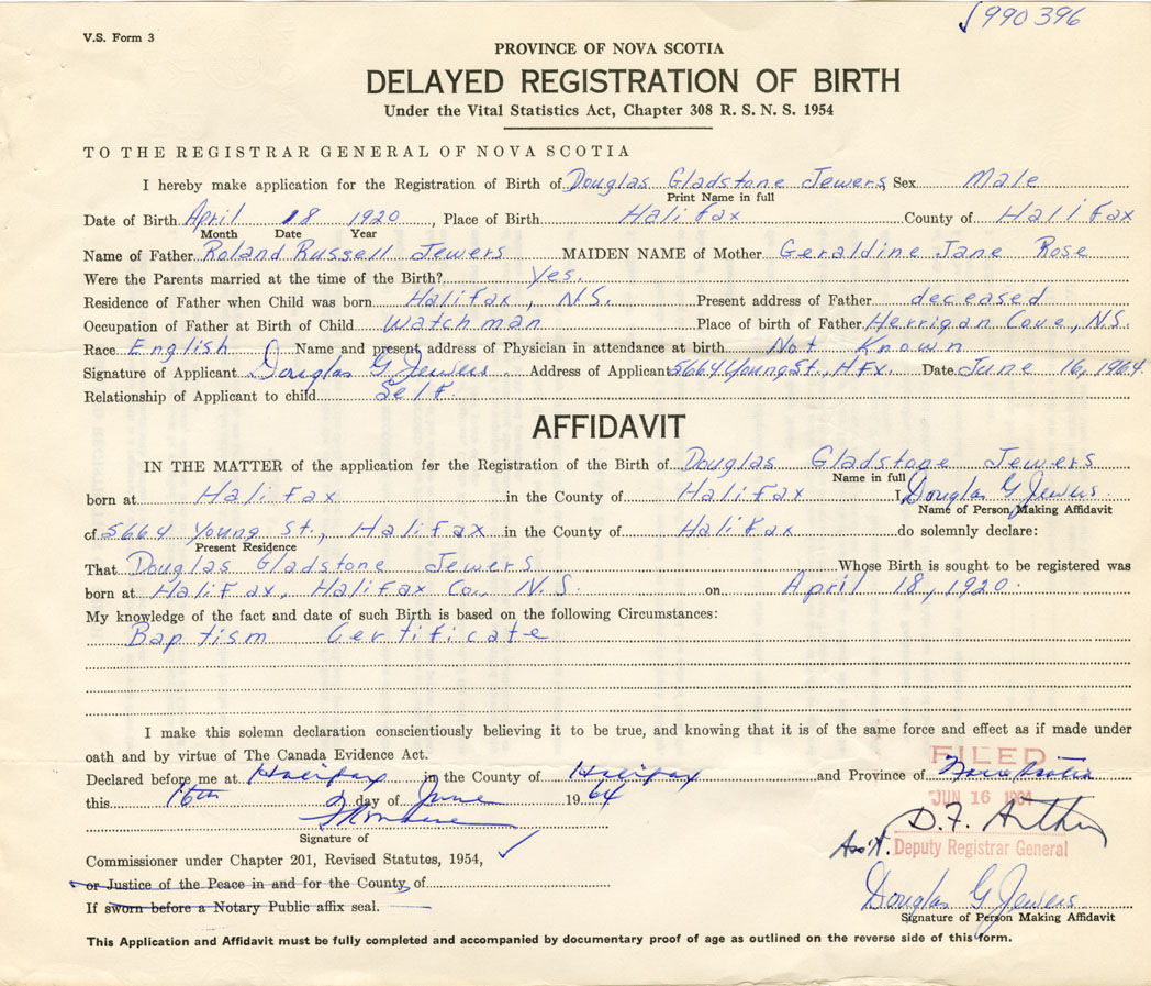 Signature of Applicant Douglas G. Jewers Address of Applicant 5664 Young Street, Halifax Date 16 June 1964