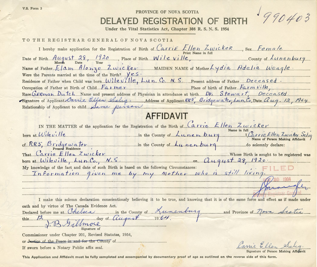 Signature of Applicant Carrie Ellen Selig Address of Applicant RR #5, Bridgewater, Lunenburg Co. Date 12 August 1964