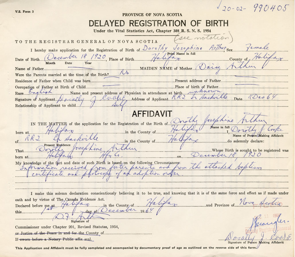 I hereby make application for the Registration of Birth of Dorothy JosephineArthur Sex