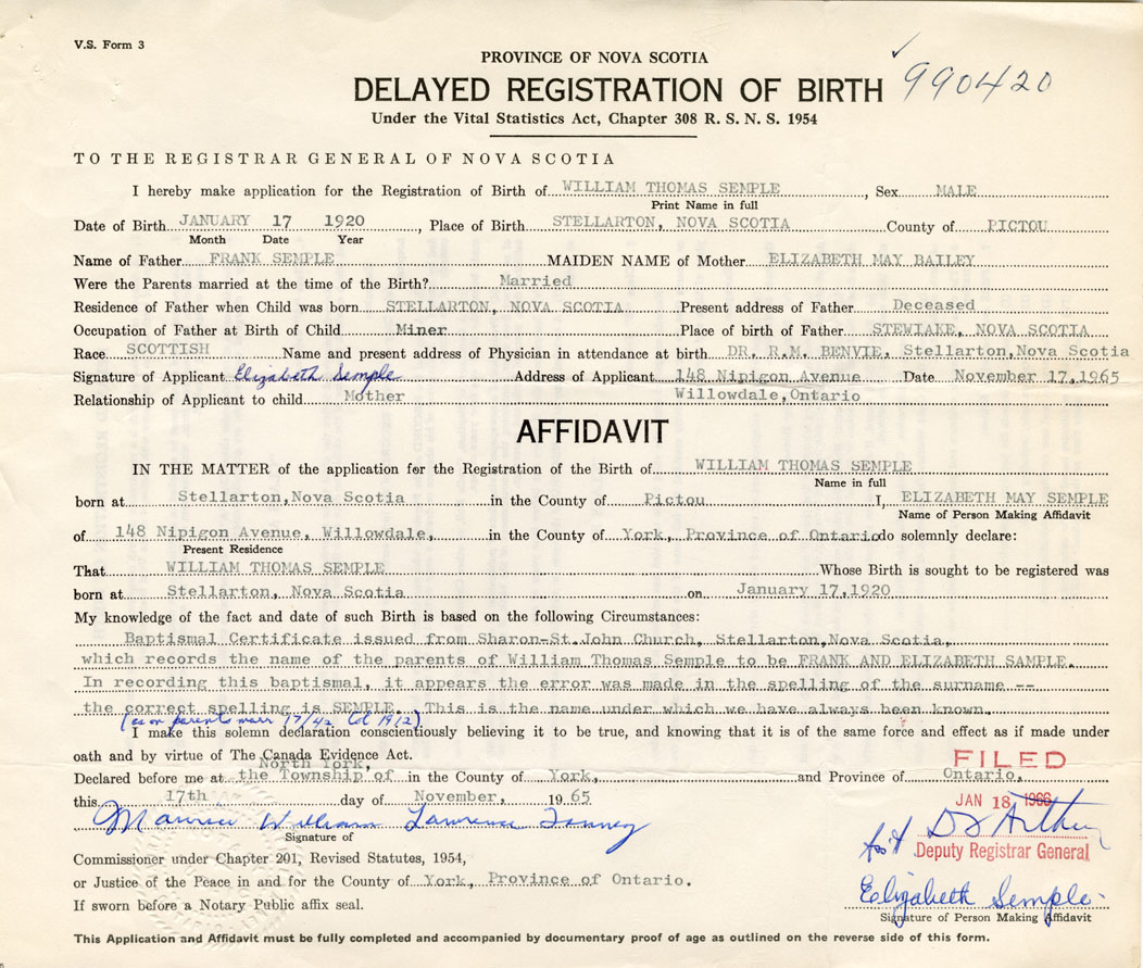 Baptismal Certificate issued from Sharon-St. John Church, Stellarton, which records the name of the parents of William Thomas Semple to be Frank and Elizabeth Semple. In recording this baptismal, it appears the error was made in the spelling of the surname. The correct spelling is Semple. This is the name under which we have always been known.