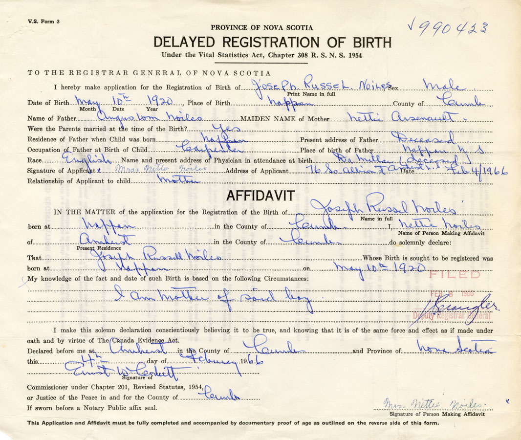 Date of Birth May 10, 1920 Place of Birth NappanCounty of Cumberland