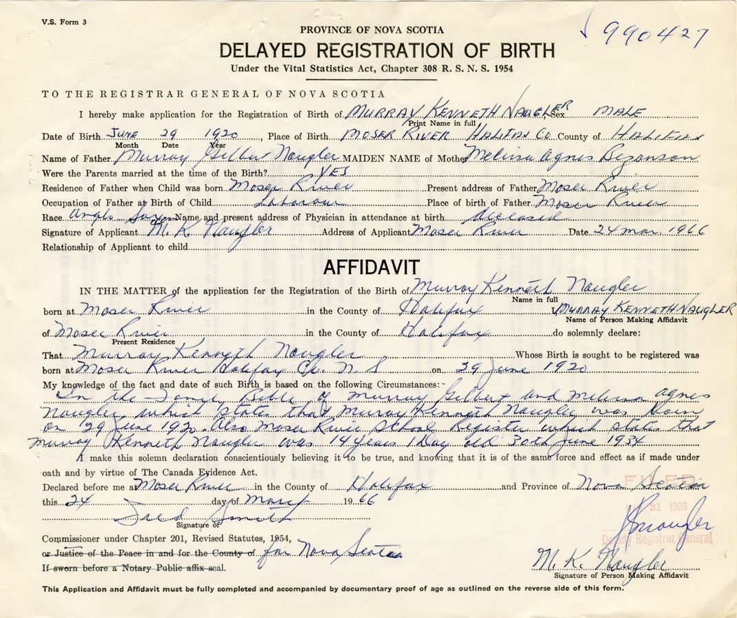 In the Family Bible of Murray Gilbert and Melissa Agnes Naugler, which state that Murray Kenneth Naugler was born on 29 June 1920. Also Moser River School Register which states that Murray Kenneth Naugler was 14 years 1 day old 30th June 1934.