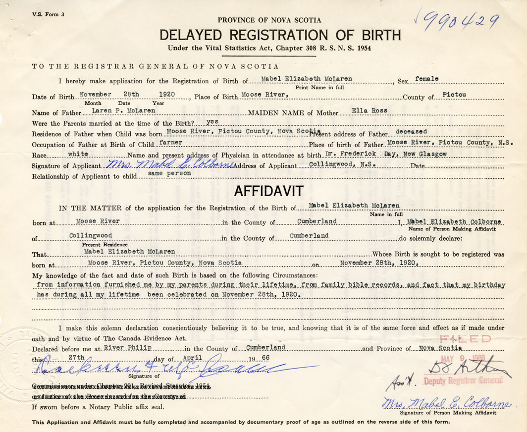 I hereby make application for the Registration of Birth of Mabel ElizabethMcLaren Sex Female