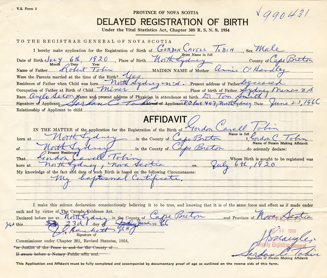 Date of Birth July 6, 1920 Place of Birth North SydneyCounty of Cape Breton