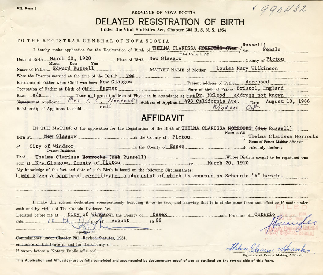 IN THE MATTER of the application for the Registration of the Birth of Thelma ClarissaRussell