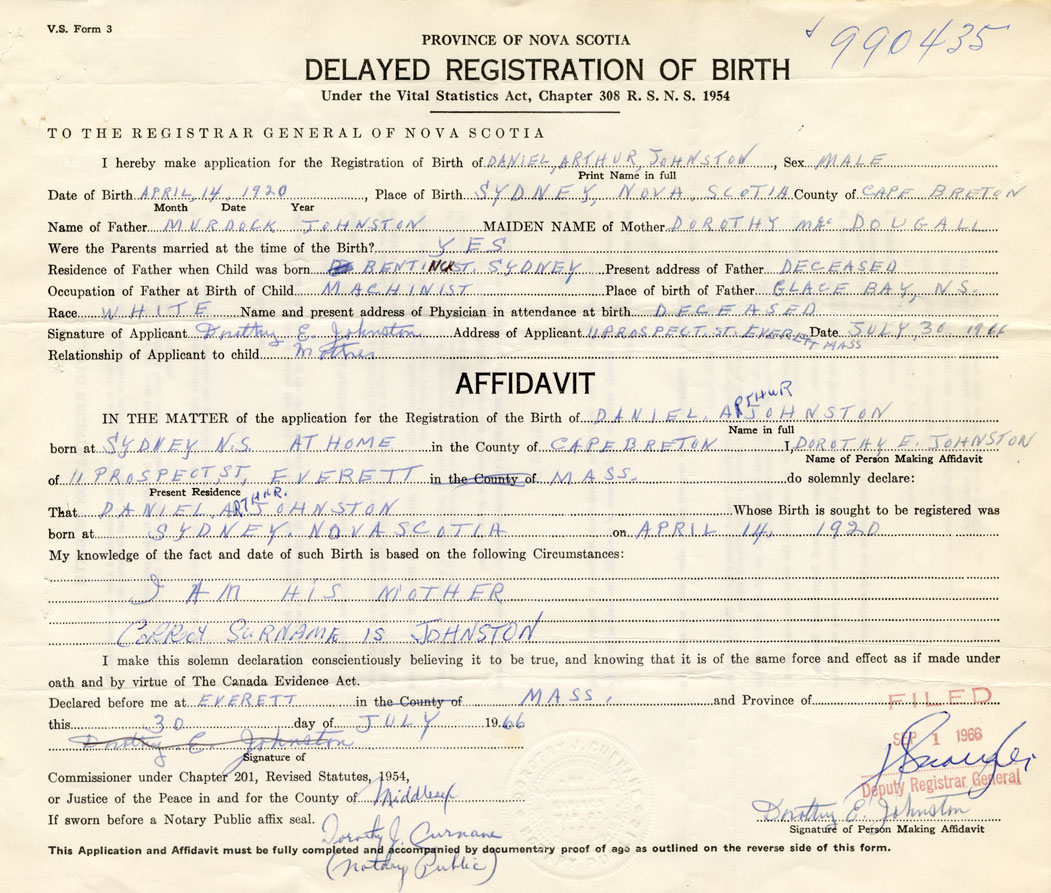 I hereby make application for the Registration of Birth of Daniel ArthurJohnston Sex Male