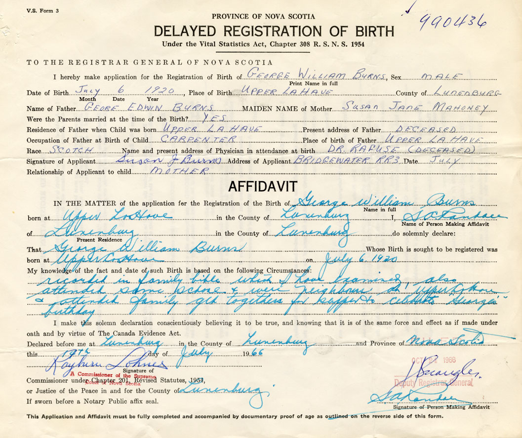 Date of Birth July 6, 1920 Place of Birth Upper LaHaveCounty of Lunenburg