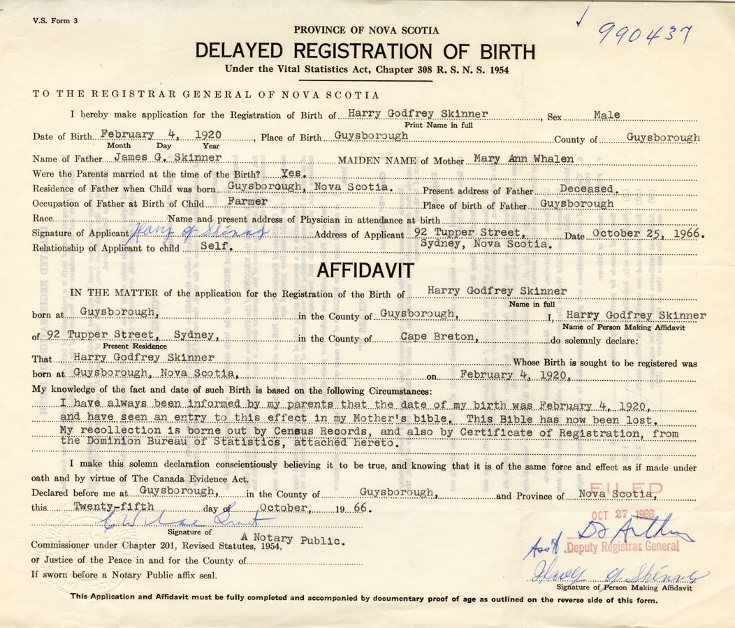I hereby make application for the Registration of Birth of Harry GodreySkinner Sex Male