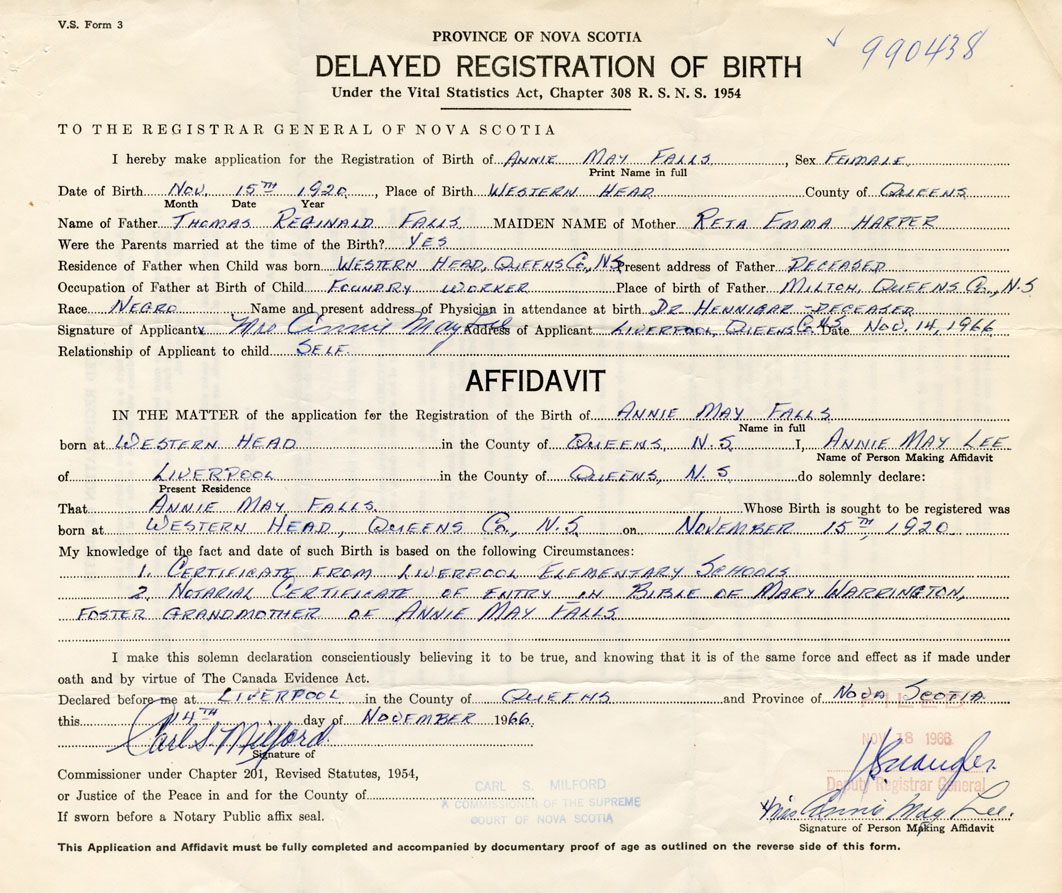 IN THE MATTER of the application for the Registration of the Birth of Annie MayFalls