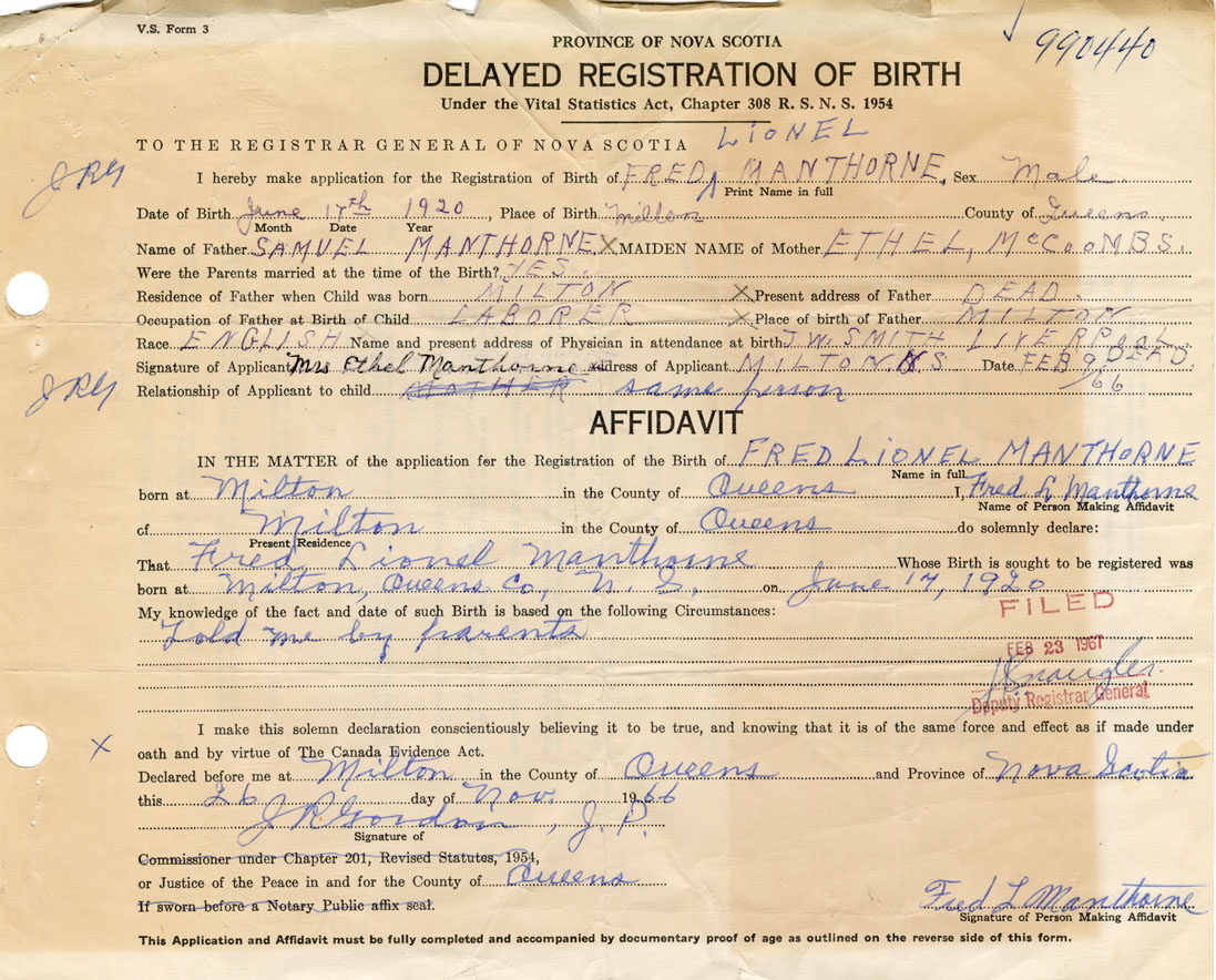 I hereby make application for the Registration of Birth of Fred LionelManthorne Sex Male
