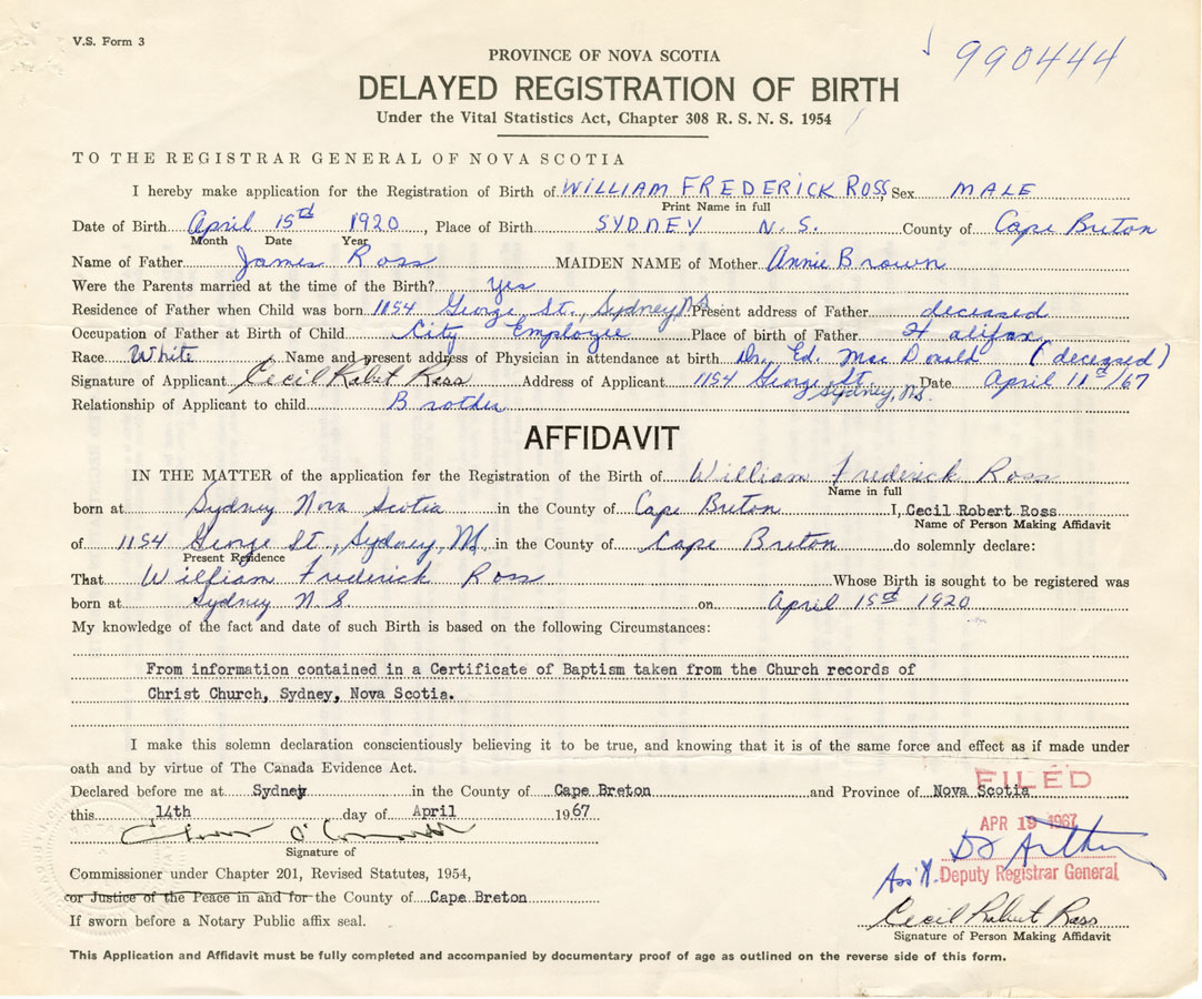 IN THE MATTER of the application for the Registration of the Birth of William FrederickRoss