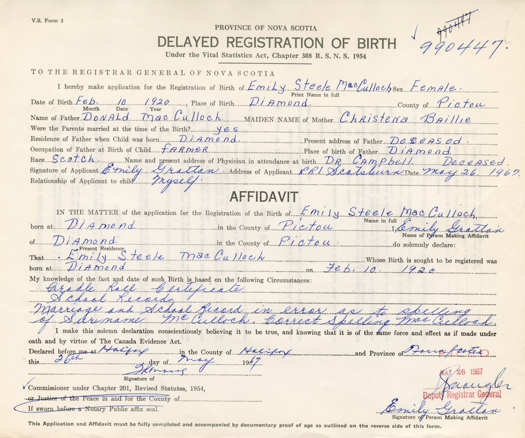 Signature of Applicant Emily Grattan Address of Applicant Scotsburn Date May 26, 1967