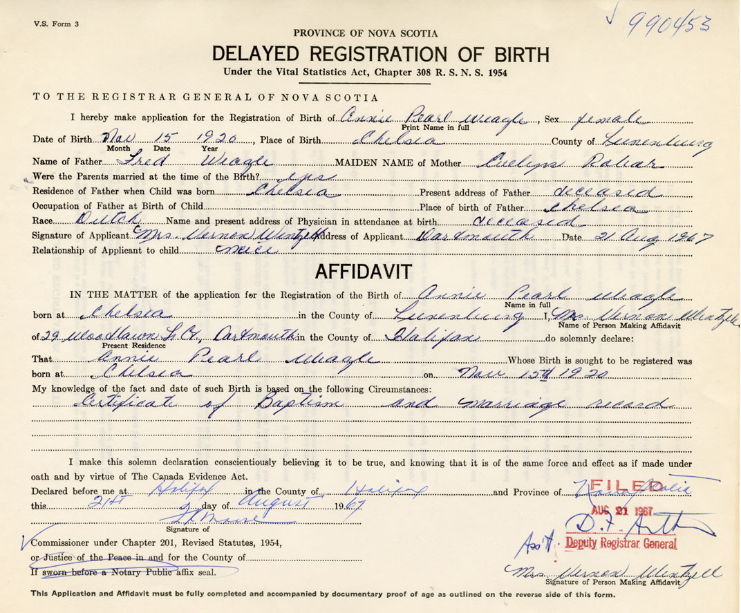 Date of Birth November 15, 1920 Place of Birth ChelseaCounty of Lunenburg