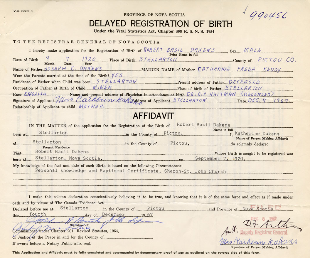 I hereby make application for the Registration of Birth of Robert BasilDakens Sex Male