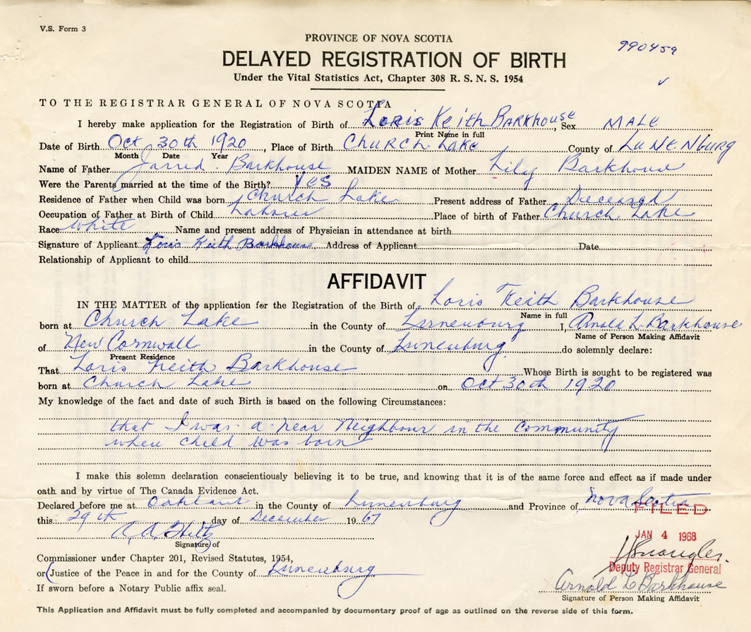 Date of Birth October 30, 1920 Place of Birth Church LakeCounty of Lunenburg