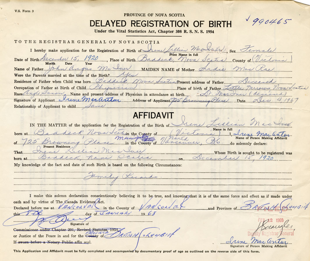 IN THE MATTER of the application for the Registration of the Birth of Irene LillianMacIver