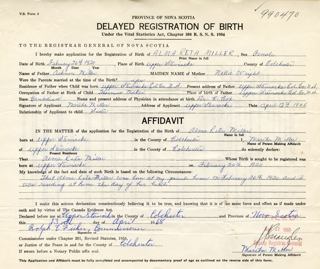 Date of Birth February 26, 1920 Place of Birth Upper StewiackeCounty of Colchester