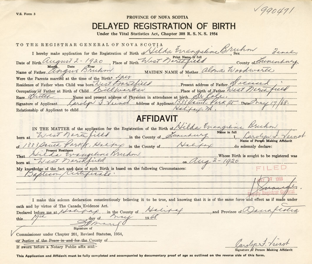IN THE MATTER of the application for the Registration of the Birth of Hilda EvangelineBruhm