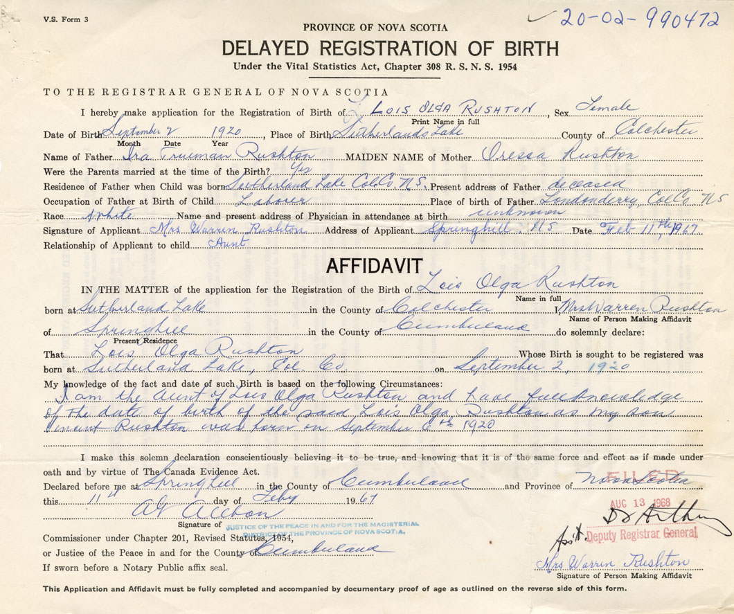 I hereby make application for the Registration of Birth of Lois OlgaRushton Sex Female