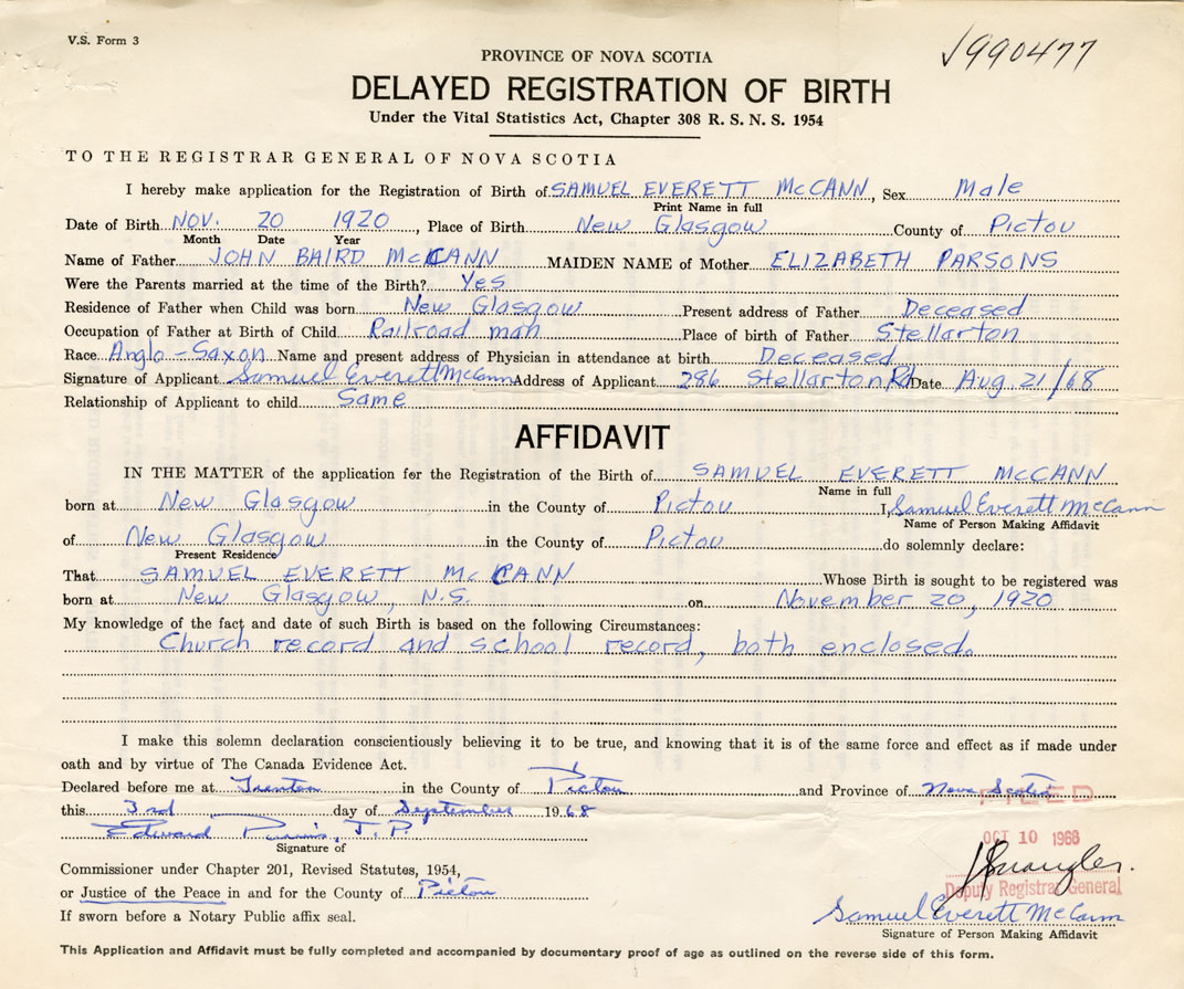 I hereby make application for the Registration of Birth of Samuel EverettMcCann Sex Male