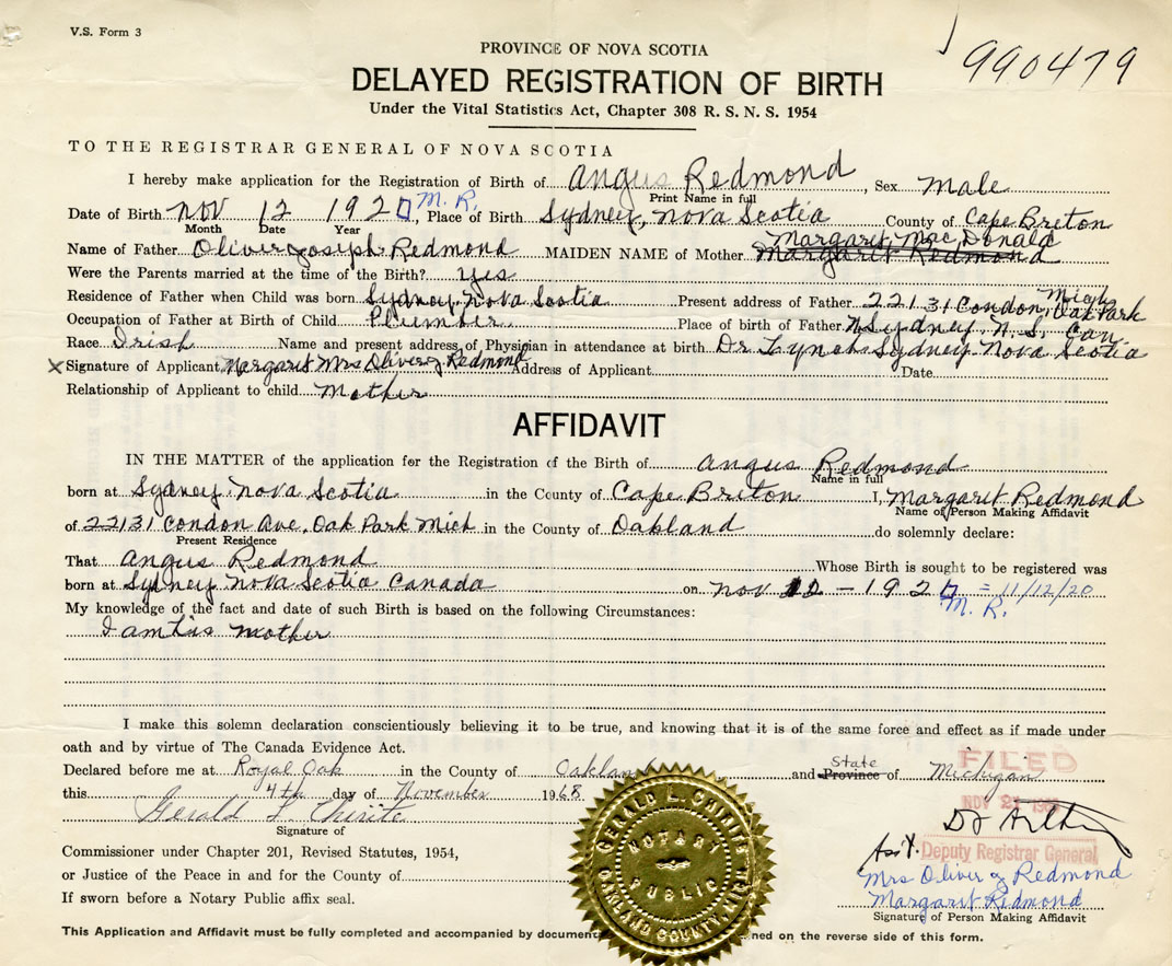 I hereby make application for the Registration of Birth of AngusRedmond Sex Male