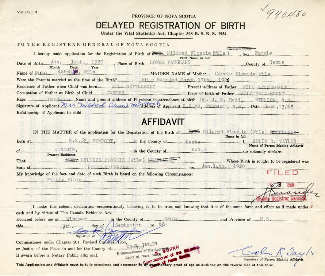 I hereby make application for the Registration of Birth of Mildred FlossieWile Sex Female
