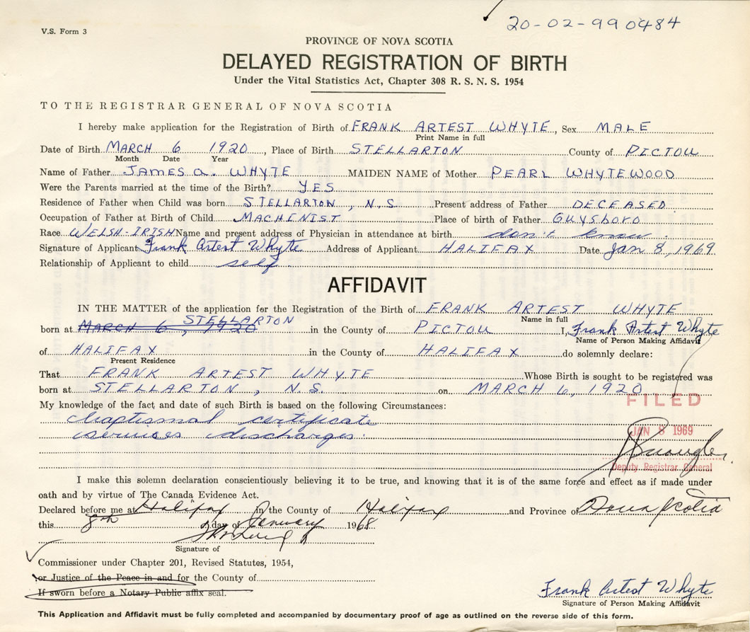 Signature of Applicant Frank Artest Whyte Address of Applicant Halifax Date January 8, 1969