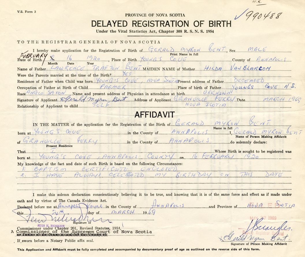 I hereby make application for the Registration of Birth of Gerald MyronBent Sex Male