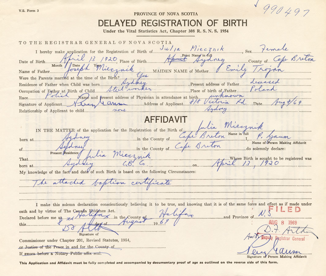 IN THE MATTER of the application for the Registration of the Birth of JuliaMiecznik