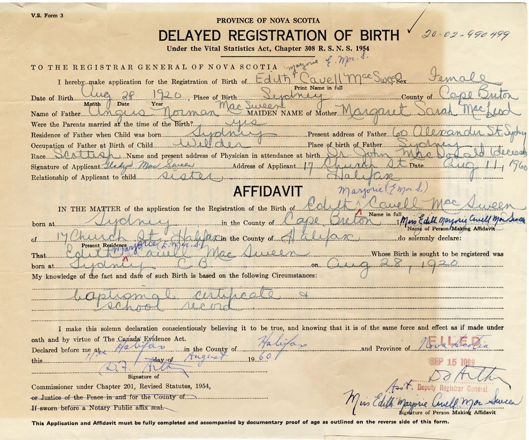 I hereby make application for the Registration of Birth of Edith Marjorie CavellMacSween Sex Female