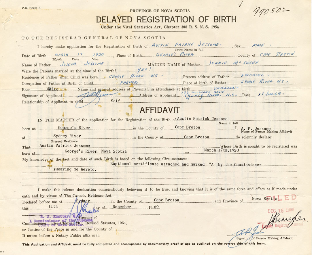 Signature of Applicant A.P. Jessome Address of Applicant Sydney River Date December 11, 1969