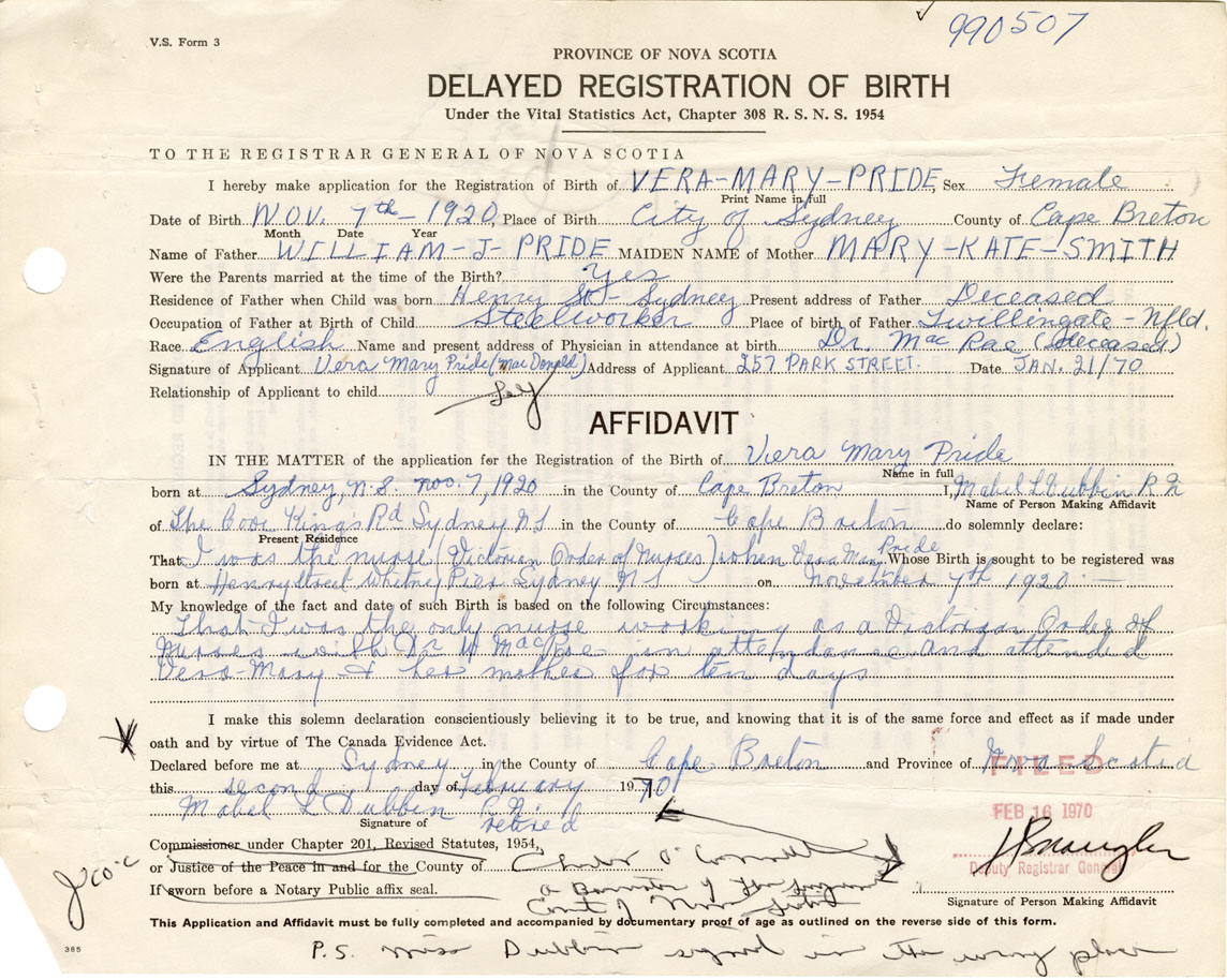 Signature of Applicant Vera Mary Pride (MacDonald) Address of Applicant Sydney Date January 21, 1970