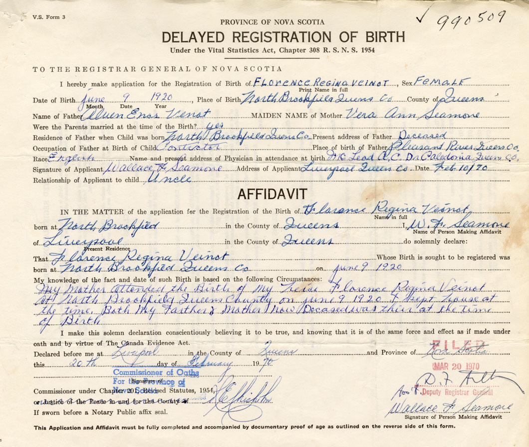 My mother attended the birth of my niece Florence Regina Veinot at North Brockfield, Queens County on June 9, 1920. I kept house at the time. Both my father & mother now deceased was there at the time of Birth.