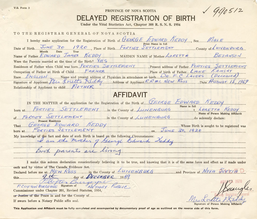 Date of Birth June 30, 1920 Place of Birth Forties SettlementCounty of Lunenburg