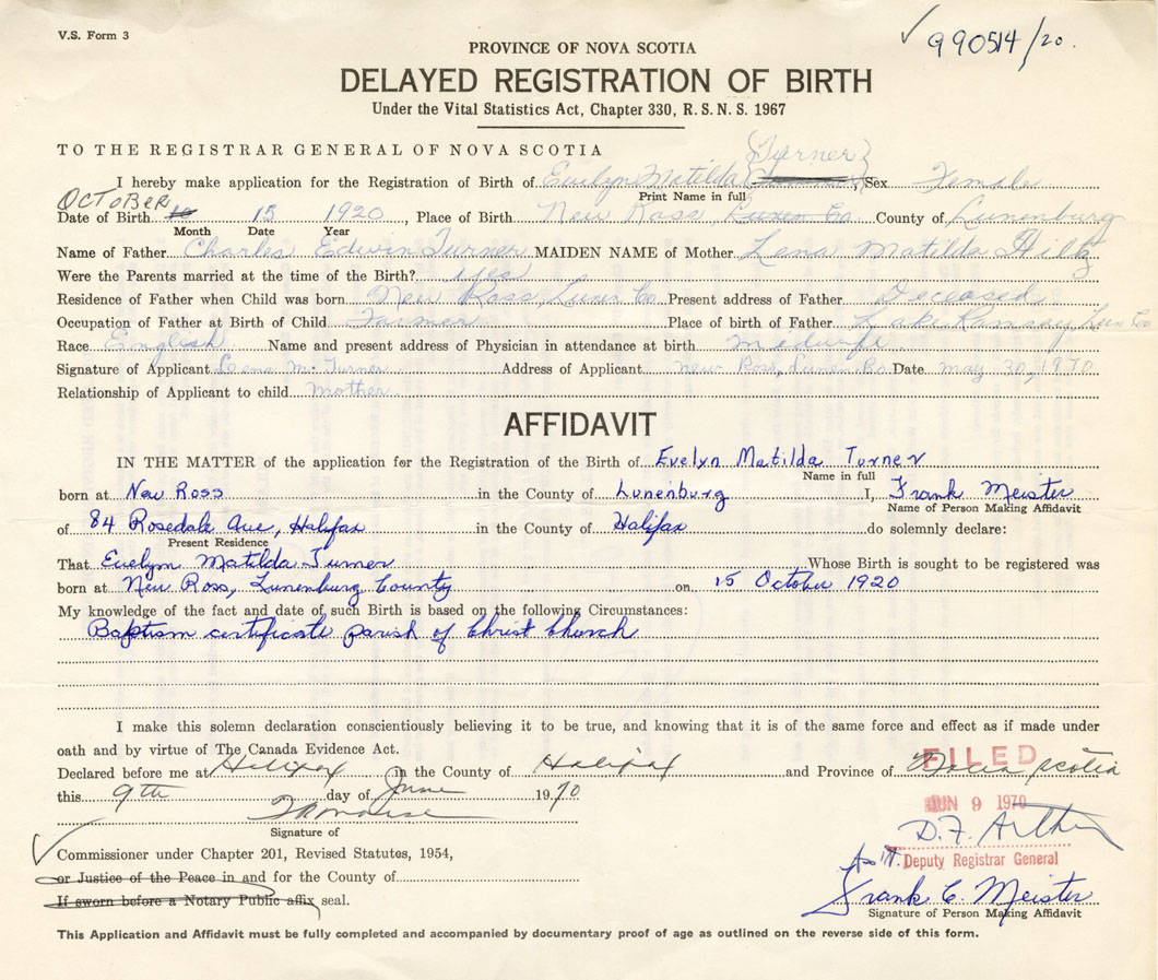 Date of Birth October 15, 1920 Place of Birth New RossCounty of Lunenburg