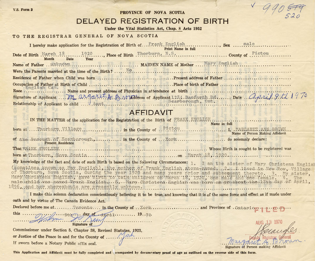 1. I am the sister of Mary Christena English (sometimes known as May English), the mother of Frank English above-named. 2. I lived in New Ross, Village of Thorburn, during the year 1920 and many years prior and subsequent thereto. 3. My sister, Mary Christena English, gave birth to twin children on March 18, 1920, one male and one female. 4. The male child was named Frank English 5. Mary Christena English was born on or about the 17th day of April, 1896, and her whereabouts are presently unknown.
