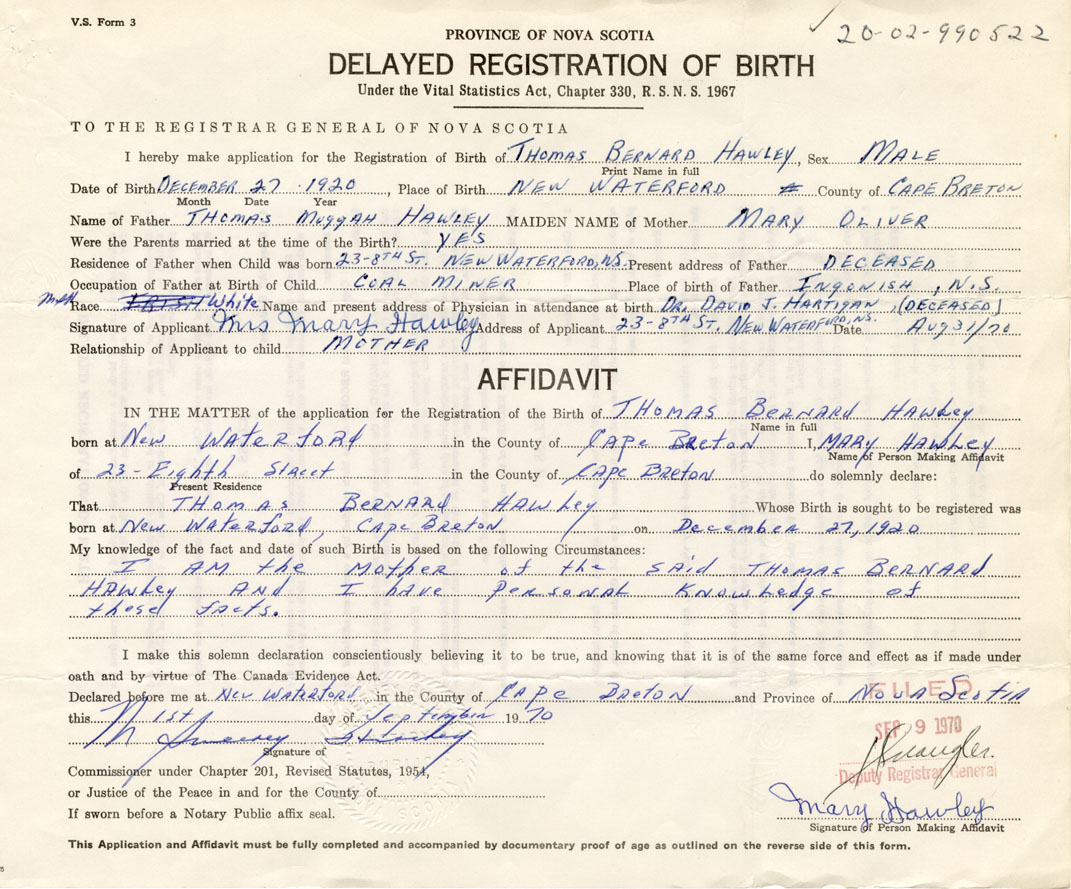 Date of Birth December 27, 1920 Place of Birth New WaterfordCounty of Cape Breton