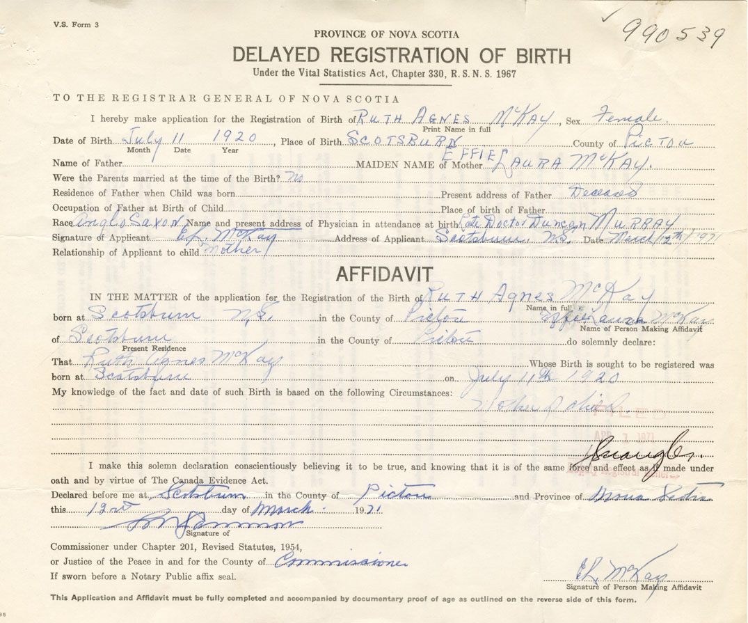 Date of Birth July 11, 1920 Place of Birth ScotsburnCounty of Pictou