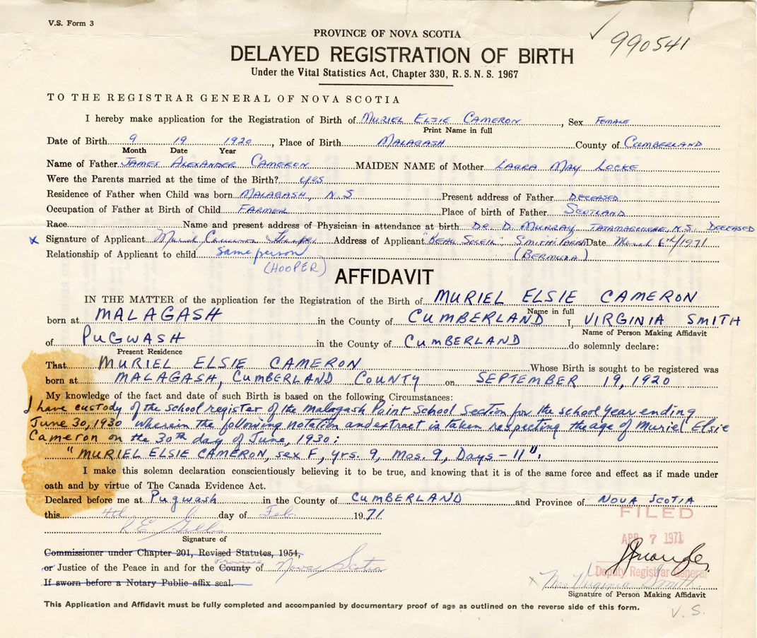 I have custody of the school register of the Malagash point School section for the school year ending June 30, 1930. Wherein the following notation and extract is taken respecting the age of Muriel Elsie Cameron on the 30th day of June 1930: "Muriel Elsie Cameron, sex F, yrs 9, mos. 9, days -11"