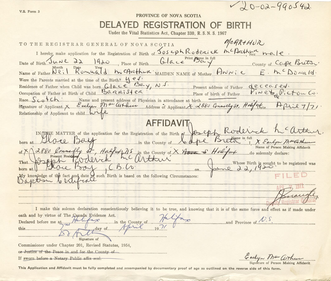 Date of Birth June 22, 1920 Place of Birth Glace BayCounty of Cape Breton