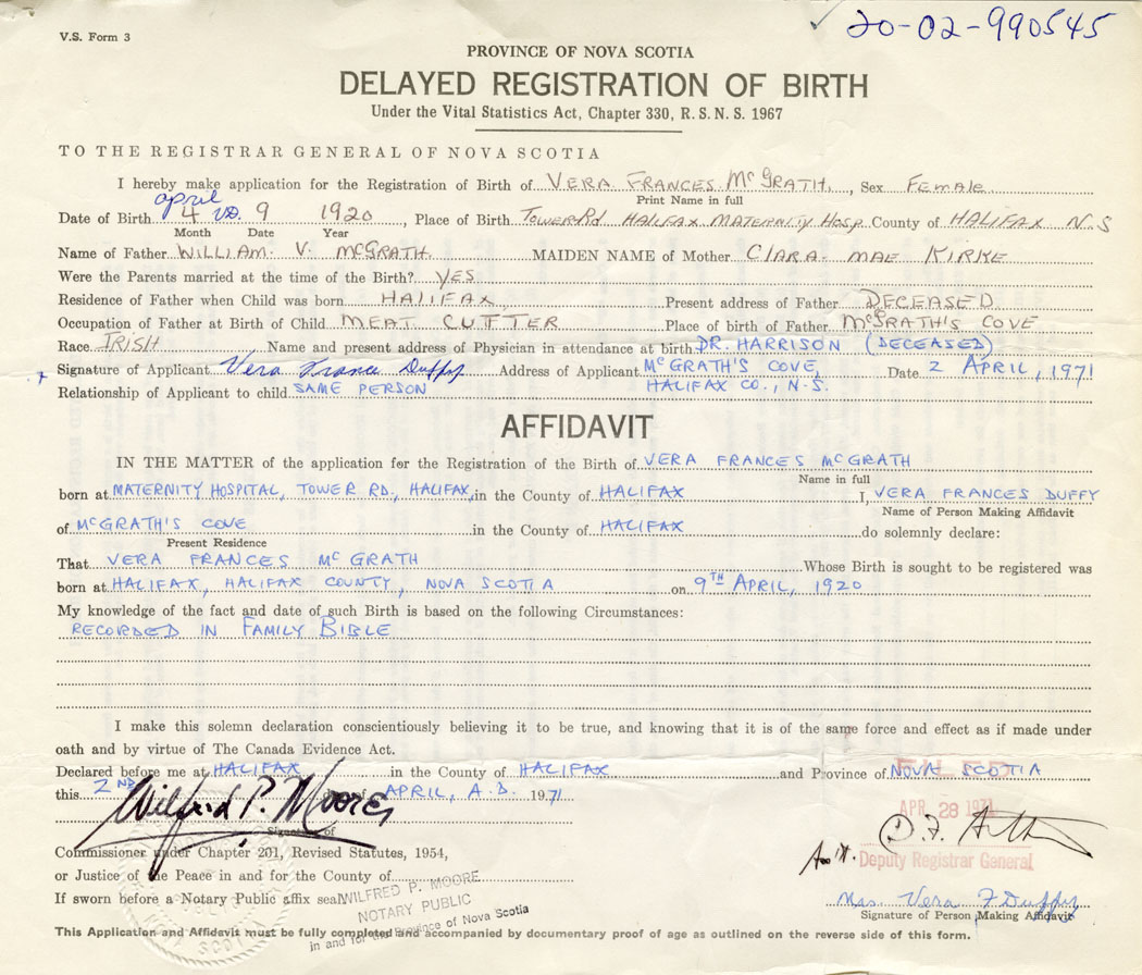 Signature of Applicant Vera Frances Duffy Address of Applicant McGrath's Cove, Halifax Date April 2, 1971