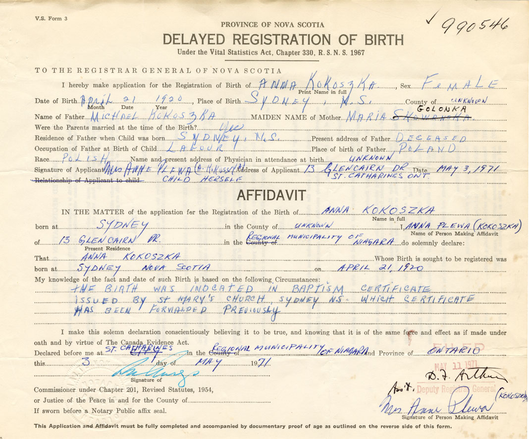Signature of Applicant Anna Plewa Address of Applicant Ontario Date May 3, 1971
