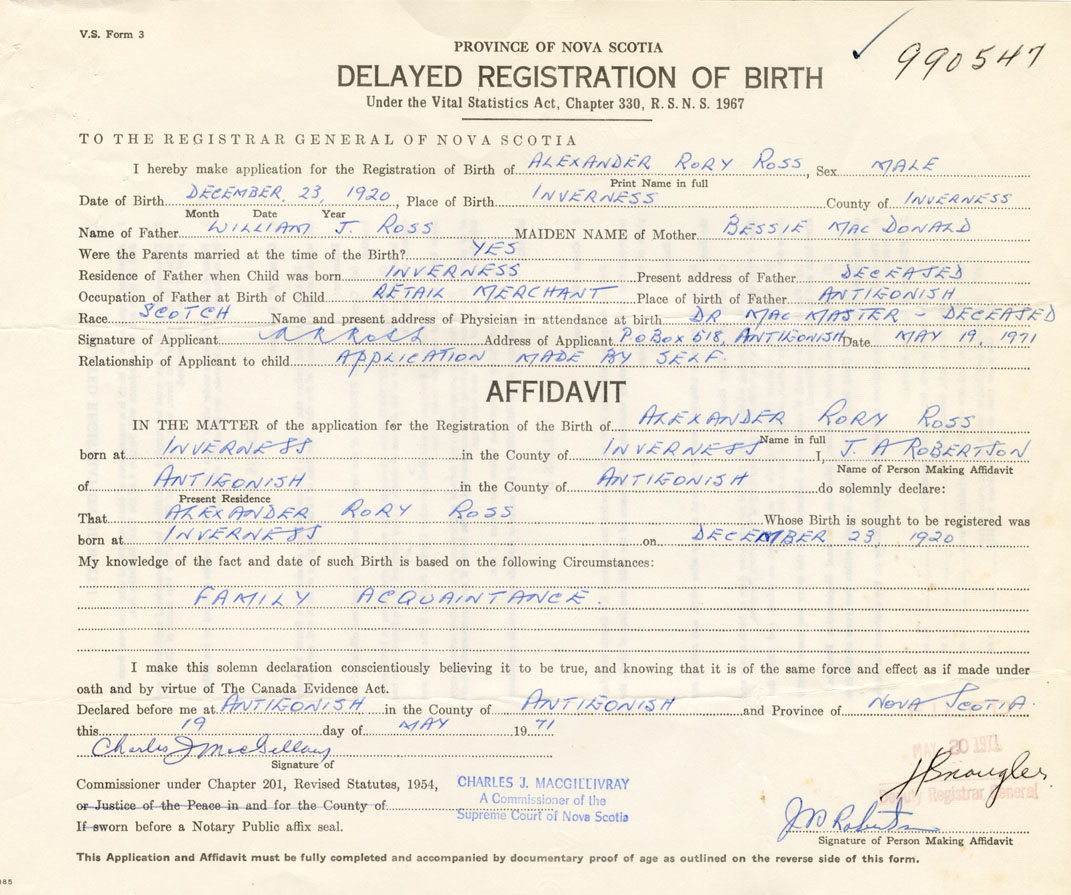 IN THE MATTER of the application for the Registration of the Birth of Alexander RoryRoss