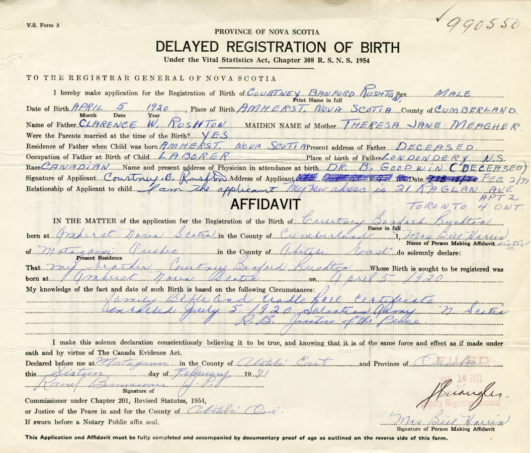 Signature of Applicant Courtney B. Rushton Address of Applicant 21 Raglan Ave, Apt. 2, Toronto, Ontario Date February 2, 1971
