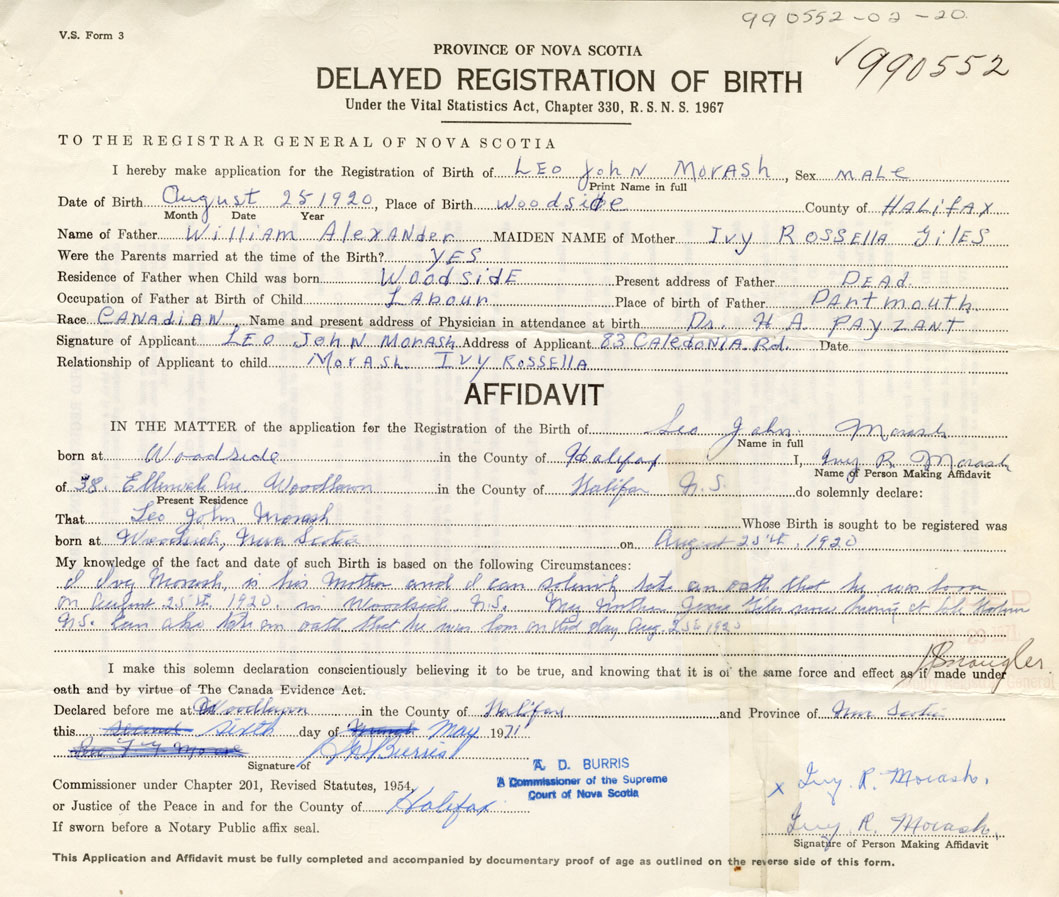 I Ivy Morash is his sister and I can solemnly state on oath that he was born on August 25th, 1920 in Woodside. My mother Jessie Giles now living at Sole Harbour, can also state on oath that he was born on the day August 25, 1920.